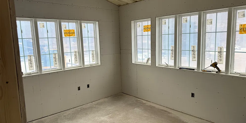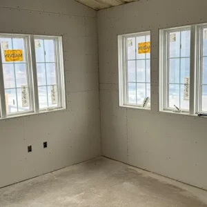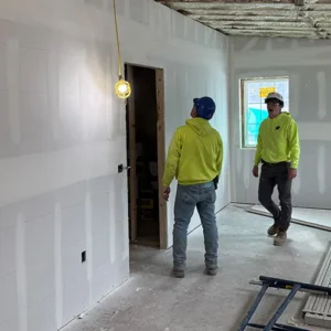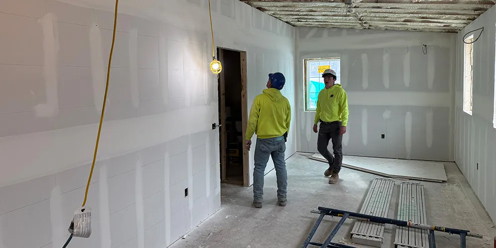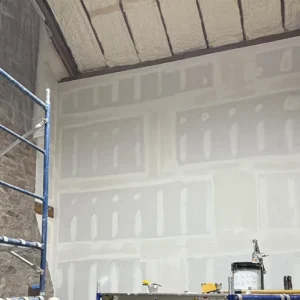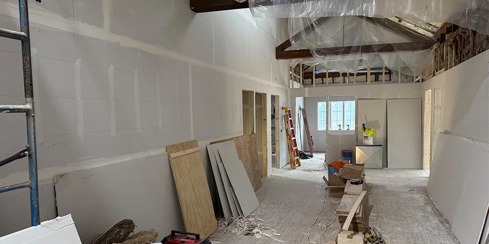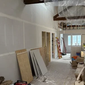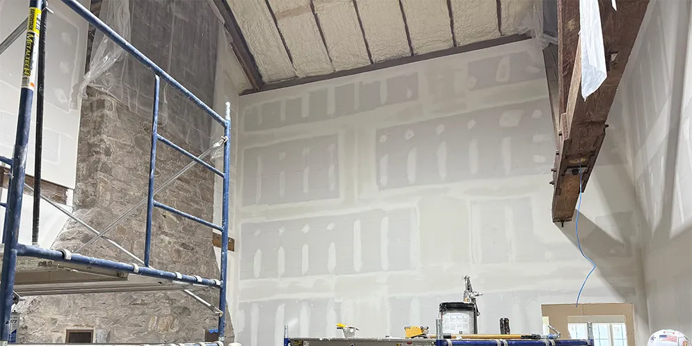 While the initial stages of the work involved a lot of demolition, framing up walls, and roughing in wiring, drain lines, and plumbing, we’re now at a point where things begin to take shape. The spray foam insulation has been applied on the office level of the building. With that nearly done, drywall installation is moving along quickly, and you can begin to see what the building will look like in finished form.